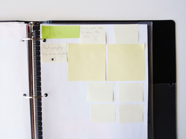Right behind the "brainstorming" section, I have a clear pocket that has a pen in it, a ruler (came with the binder), and a big sticky note pad. I actually got mine as a prize at an adult's arcade called Dave and Buster's (cool, right?), but you can easily make your own by gluing sticky note pads to a thick piece of cardstock.